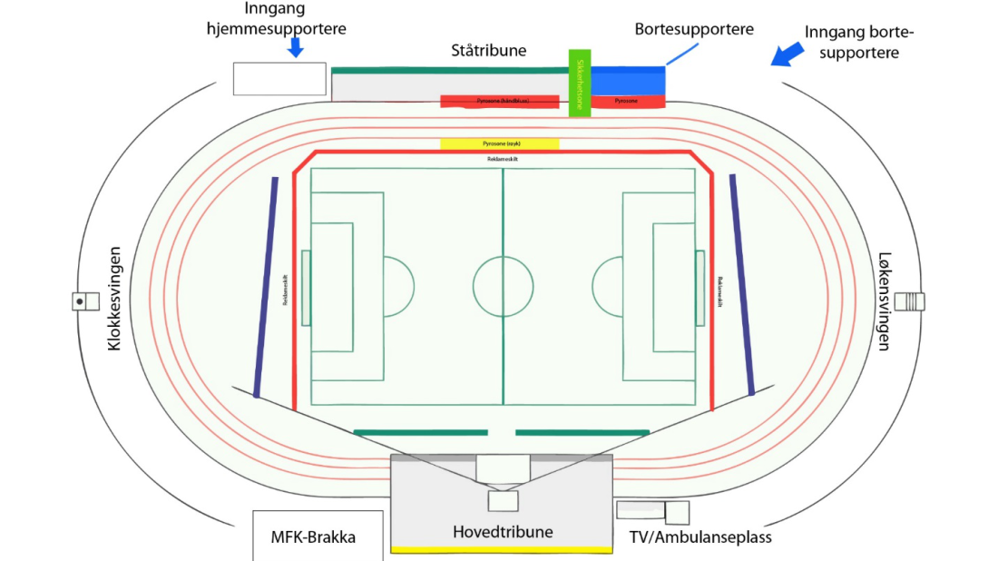 Det kan kun benyttes pyroteknikk på markerte soner (markert i rødt) på stadionkartet.