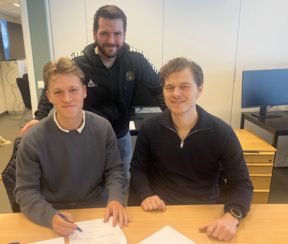 Her signerer Robert Marcus (til venstre) kontrakten sammen med sin agent Christoffer Thrane (til høyre) med Ole Martin smilende i bakgrunnen.